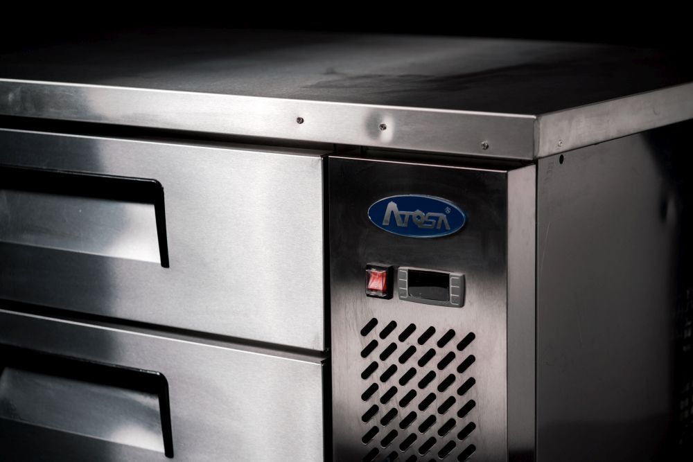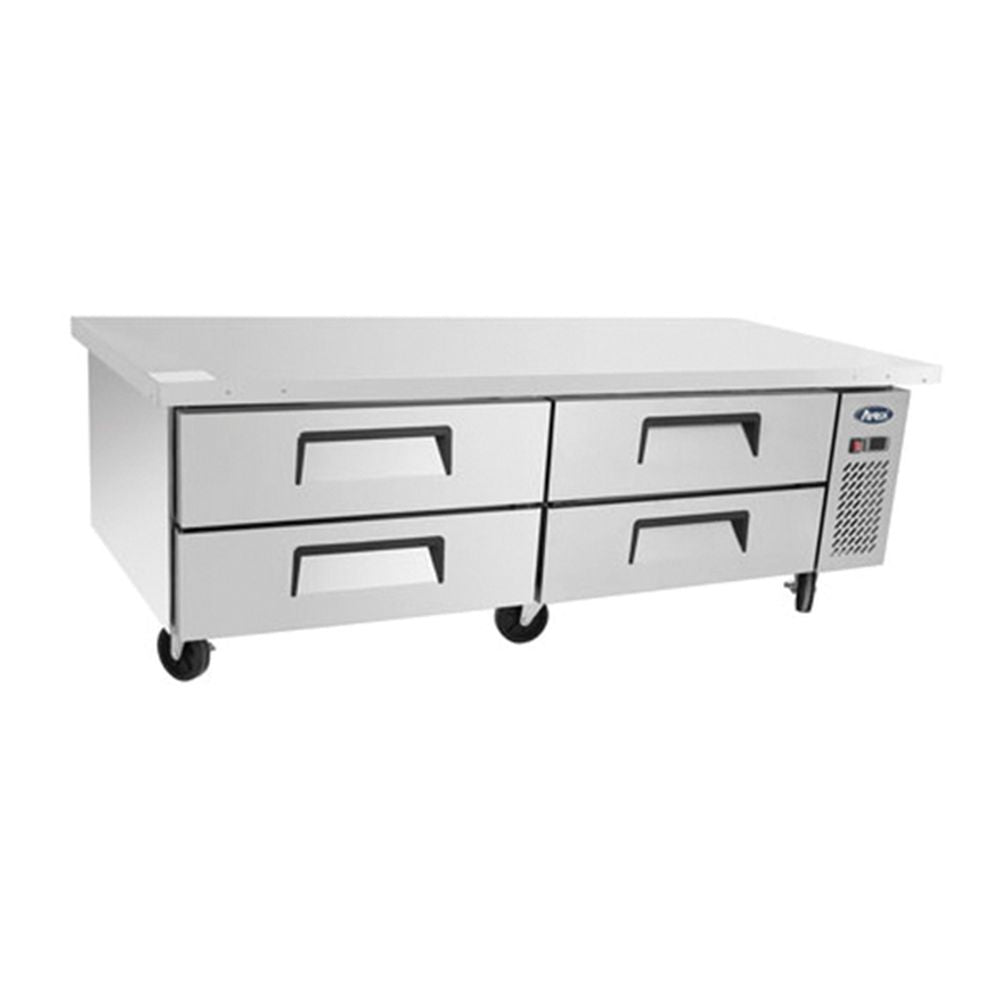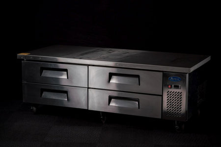 Create an organised and robust work station with the Atosa 4 Drawer Chef Base. Combining refrigerated storage and a sturdy work surface for countertop equipment, this unit is a heavy duty addition to any commercial kitchen. The interior and exterior is built from hard-wearing, corrosion-resistant stainless steel, and well as its 4 drawer, slides, and rollers. The drawers are gravity-fed and self-closing, and feature recessed handles. The magnetic door gasket is removable for easy cleaning and maintenance.