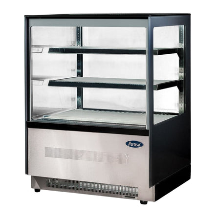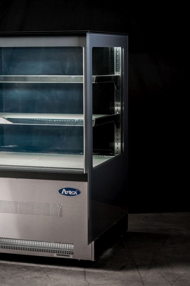 Ideal for bakeries, cafes and take-away restaurants, the Atosa 1700mm Free-Standing Square Cake Showcase creates an appetizing and stylish product display. Its two shelves plus floor offer maximum exposure over 3 levels including a generous 570L capacity, as well as LED lights for optimal visibility. Refrigerated at 2°C to 8°C, it keeps cakes cool, with the heated glass preventing condensation. It is fitted with a SECOP compressor and Italian digital controls, as well as removable sliding back doors and castors for easy accessibility and mobility.