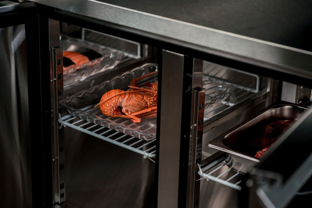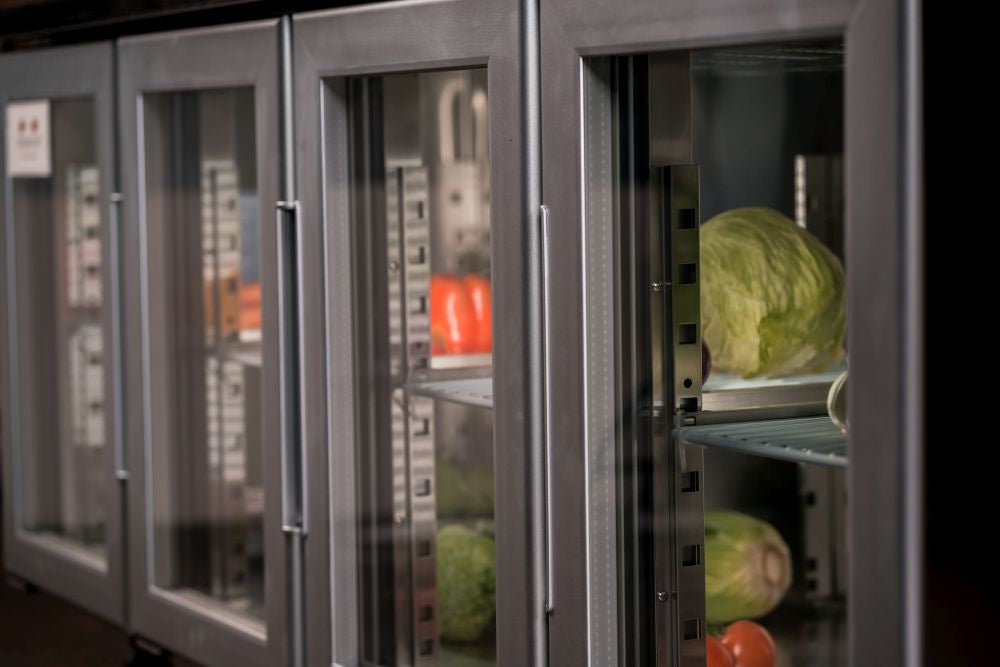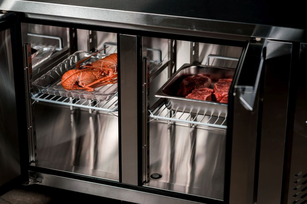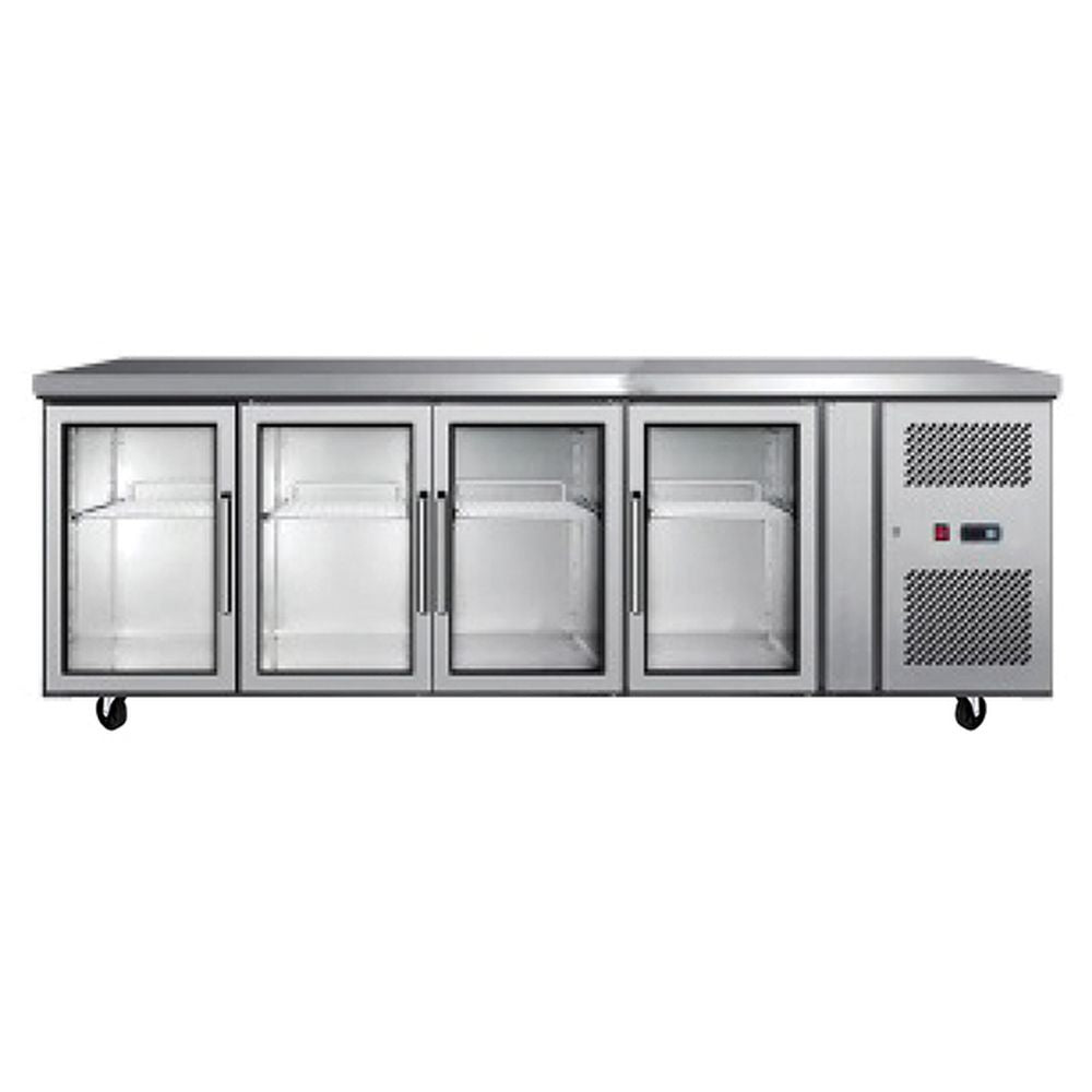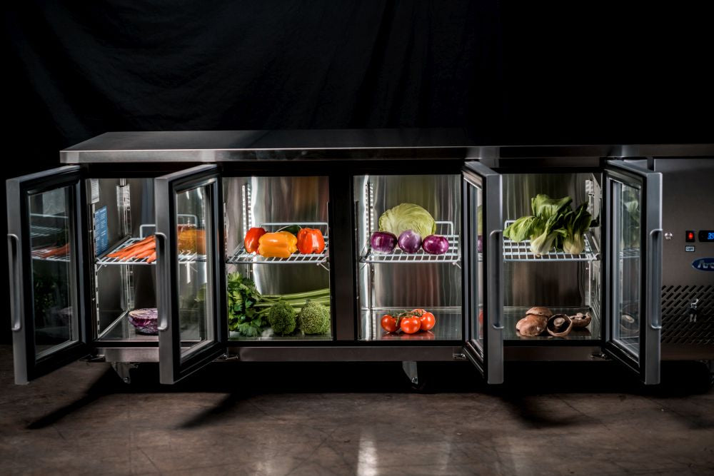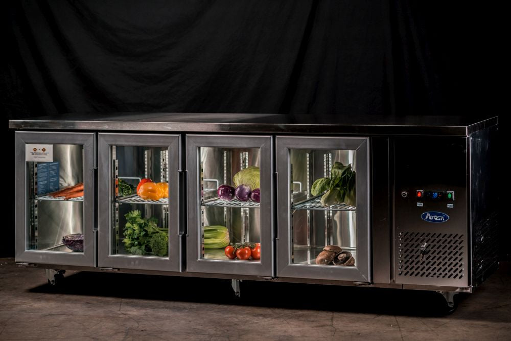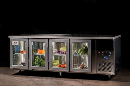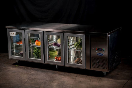 A reliable and robust work surface combined with cold storage, the Atosa Glass Four Door Cooling Table is tailored to withstand the working conditions of even the hottest kitchens. Its cold storage compartment features a stainless steel interior and exterior and is fitted with insulation foam, as well as with European-made parts including an Aspera compressor and an EDM fan motor, as well as a Carel or Dixell digital controller. Arrives complete on castor wheels for easy mobility.