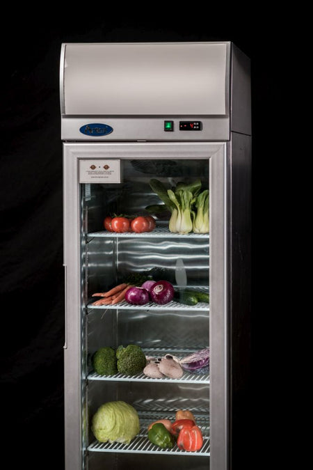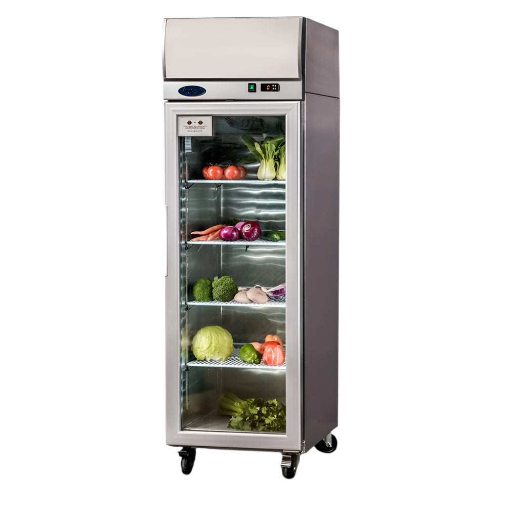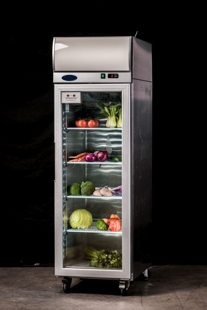 Sturdy and efficient, the Atosa Top Mounted Single Glass Door Fridge with light box is a refrigeration and display solution that is built to last. Featuring a robust exterior and interior stainless steel construction, this fridge is fitted with heavy duty Embraco compressor units, is equipped with a Dixell digital temperature control system, and arrives with pre-installed shelves and castors for ease of use and mobility. Its refrigerated cabinet sports a glass door for visibility, ideal for visual merchandising while you have peace of mind that the fan-forced cooling system keeps your products chilled no matter how hot it gets outside.
