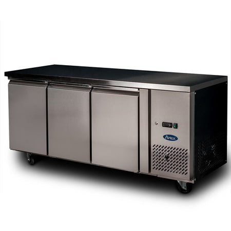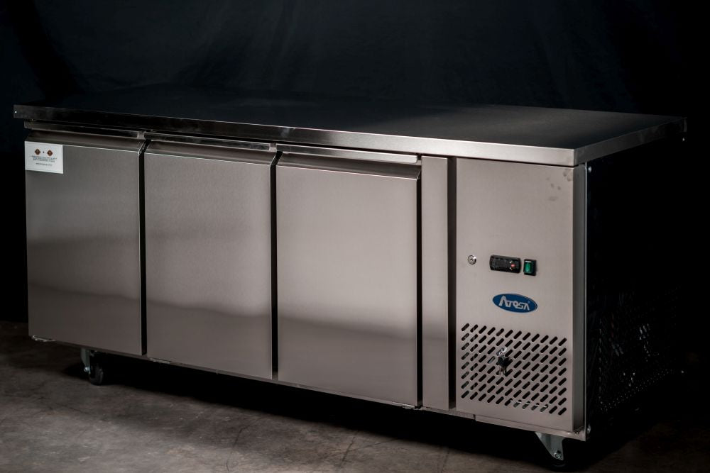 Engineered for optimal refrigeration in even the hottest kitchens, the Atosa Three Door Freezer Table is an ideal solution combining a spacious work surface with storage for frozen food products. Built with a stainless steel interior and exterior, this unit is fitted with insulation foam and ensures zero emissions. It is fitted with European-made parts including an Aspera compressor and an EDM fan motor, as well as a Carel or Dixell digital controller. Arrives complete on castor wheels for easy mobility.