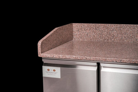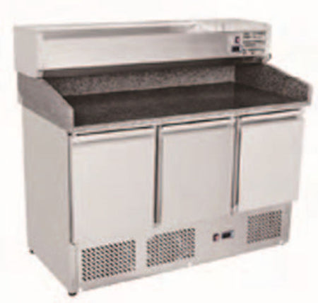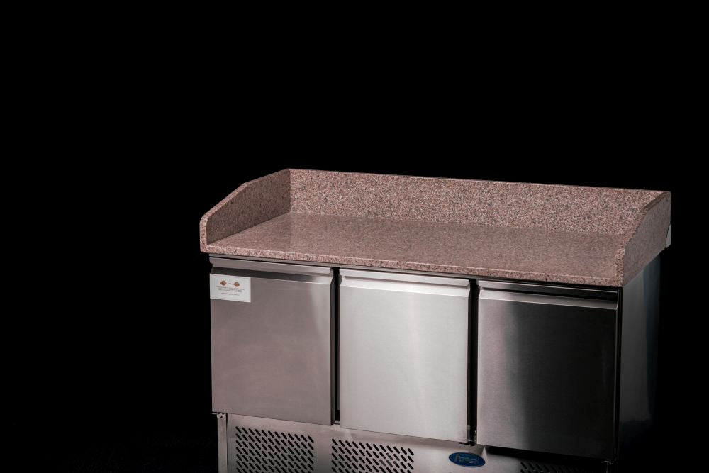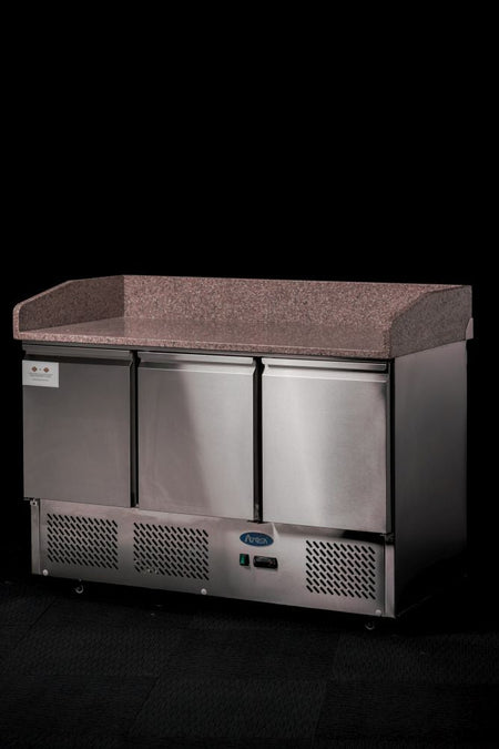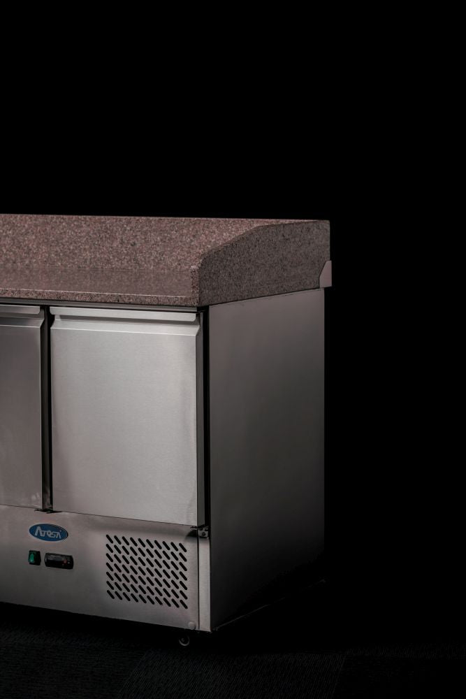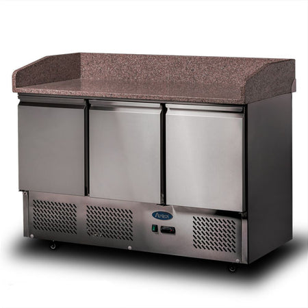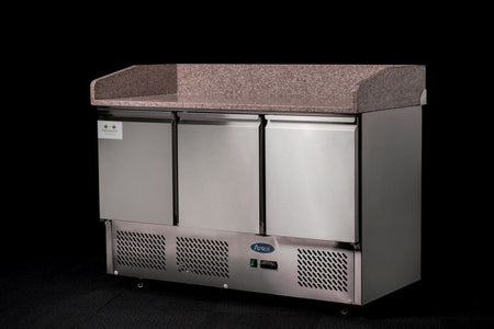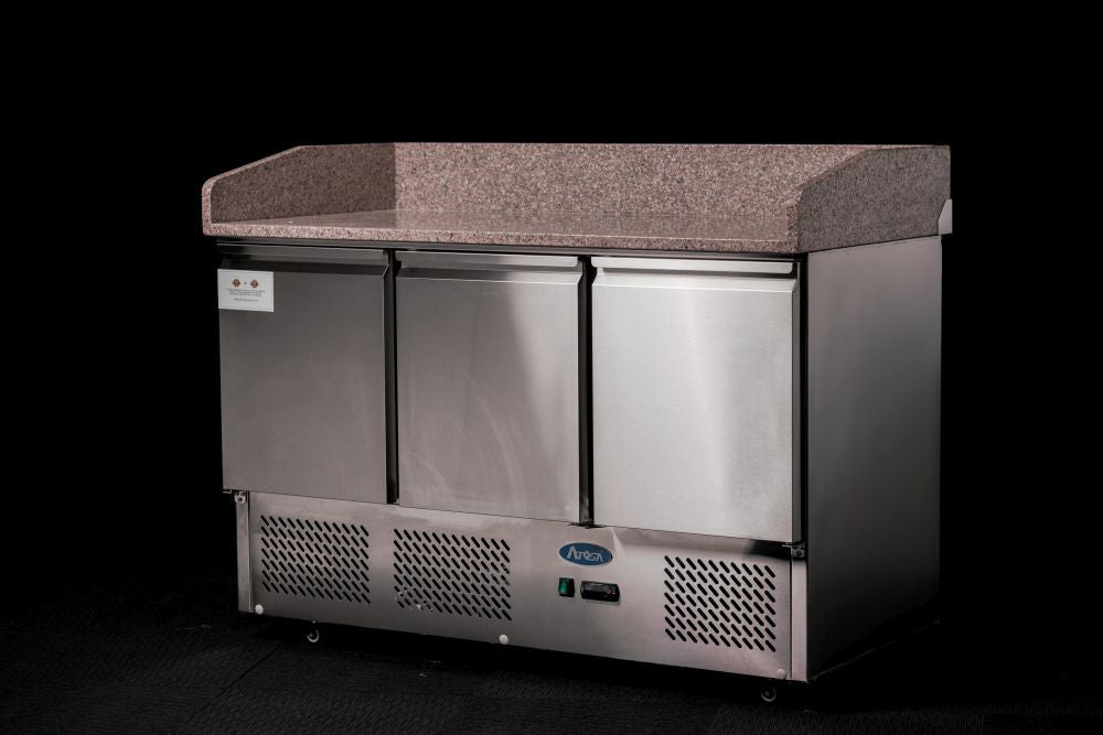 The Atosa Three Door Pizza table is a compact and heavy duty unit ideal for catering and busy kitchens, designed for preparing and topping pizzas. Engineered for optimal performance in hot environments, this saladette fits standard GN pans (not included) and sports a stainless steel top and spacious marble prep area, ideal for pizza. The lower compartment offers insulated cold storage with 3 self-closing doors, the interior and exterior built from hard-wearing stainless steel and including white Epoxy shelves and stainless steel rails. It offers a static cooling system operating at a temperature of 2°C to 8°C with self-evaporating drainage, and is fitted with European-made parts including an Aspera compressor and an EDM fan motor, as well as a Carel or Dixell digital controller. Arrives with 4 castors installed for easy mobility.