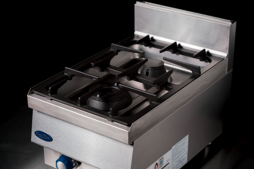 Great value commercial 2 burner stove top from CookRite. Ideal for compact restaurants and commercial kitchens. With two manually controlled independent burners, this unit gives dependable stove space in confined commercial kitchens. Easy to use and operate manual flame start operation with safety flame failure. Includes solid cast iron trivets that withstand high demand kitchens. Heavy-duty frame and corrosion-resistant, seam-free 304 stainless steel finish on the front, sides, legs, allow for quicker kitchen cleanup.