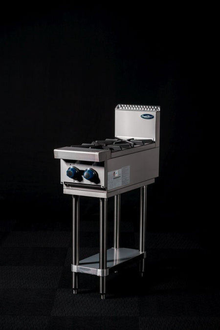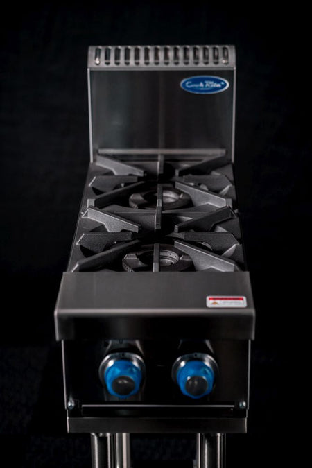 Compact bench mounted commercial 2 burner stove top from CookRite by Atosa. Ideal add-on appliance for restaurants that need extra cooking space without rearranging the entire kitchen. With 2 manually controlled (23Mj) independent burners, this unit gives you extra cooking space for when you need help you get multiple orders out on time. Easy to use and operate manual flame start with safety flame failure. Includes easy to clean solid cast iron trivets which will stand strong high demand kitchens. Heavy-duty frame and corrosion-resistant, seam-free 304 stainless steel finish on the front, sides, and legs, not only looks sleek but along with the easy to remove drip tray allows for quicker kitchen cleanup.