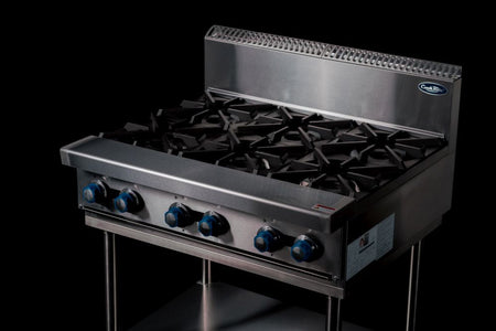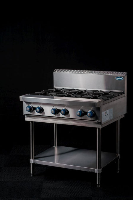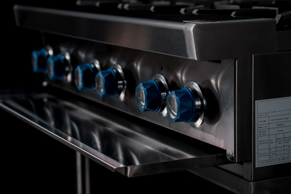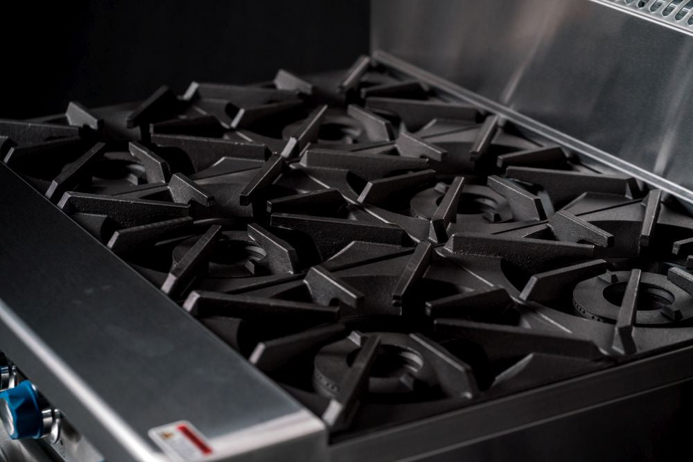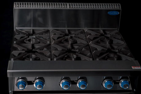 The Ideal appliance for restaurants and commercial kitchens that need extra cooking space. 6 manually controlled (28Mj) independent burners, this unit gives you dependable stove space for when you need to get multiple orders out on time. Easy to use and operate manual flame start operation with safety flame failure. Includes solid cast iron trivets that withstand high demand kitchens. Heavy-duty frame and corrosion-resistant, seam-free 304 stainless steel finish on the front, sides, and legs, easy to remove drip tray allow for quicker kitchen cleanup.