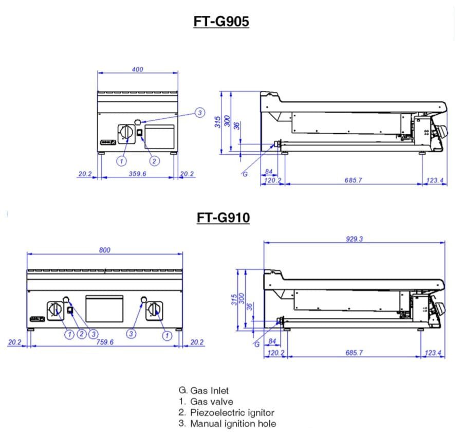 We design our fry-tops so that the plate and countertop joints are made with radii and rounded angles, according to the EN-203-3 standard criteria on materials in contact with food. These radii on edges and corners are never less than 3.5 mm, which facilitates cleaning. The tilting of the plate towards the front facilitates the collection of fats and liquids towards the collection hole, to be poured into the removable fat collection drawer. We offer the option of adding anti-splatter back splashes, which are easily removable and washable since they composed of three detachable parts.