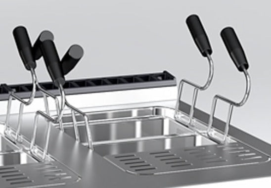 - GN-2/3 wells, with 26 litre capacity (they can be used with different positions of baskets of different sizes).