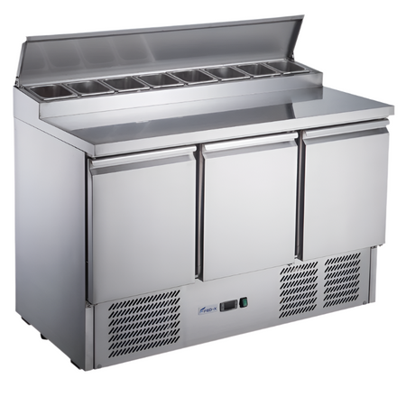 This Salad bar fridge prep is the ideal choice for small and medium businesses that need performance, professional-grade commercial refrigeration. With 3 solid Stainless steel doors, it's compact in size so you can make the most of your workspace and kitchen.