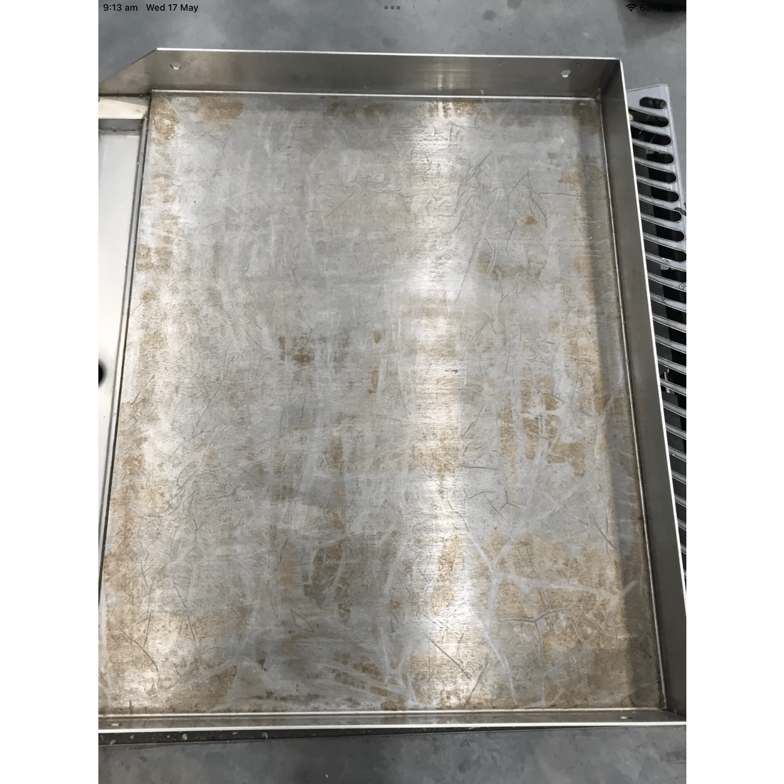 - The fry top is tilted towards the front to make it easier to collect grease and liquids.