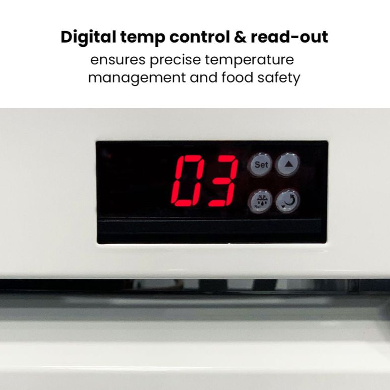 It’s a powerful display fridge which comes with a prominent decorative white colour, with a large 1200 litre space for storage that aims to keep your ingredients cool and refreshed. It features five levels of strong shelving, interior LED lighting, powerful embraco compressors, digital temperature control, fan-forced evaporator cooling, self-evaporating drainage and double-glazed doors for extra toughness and optimal viewing.