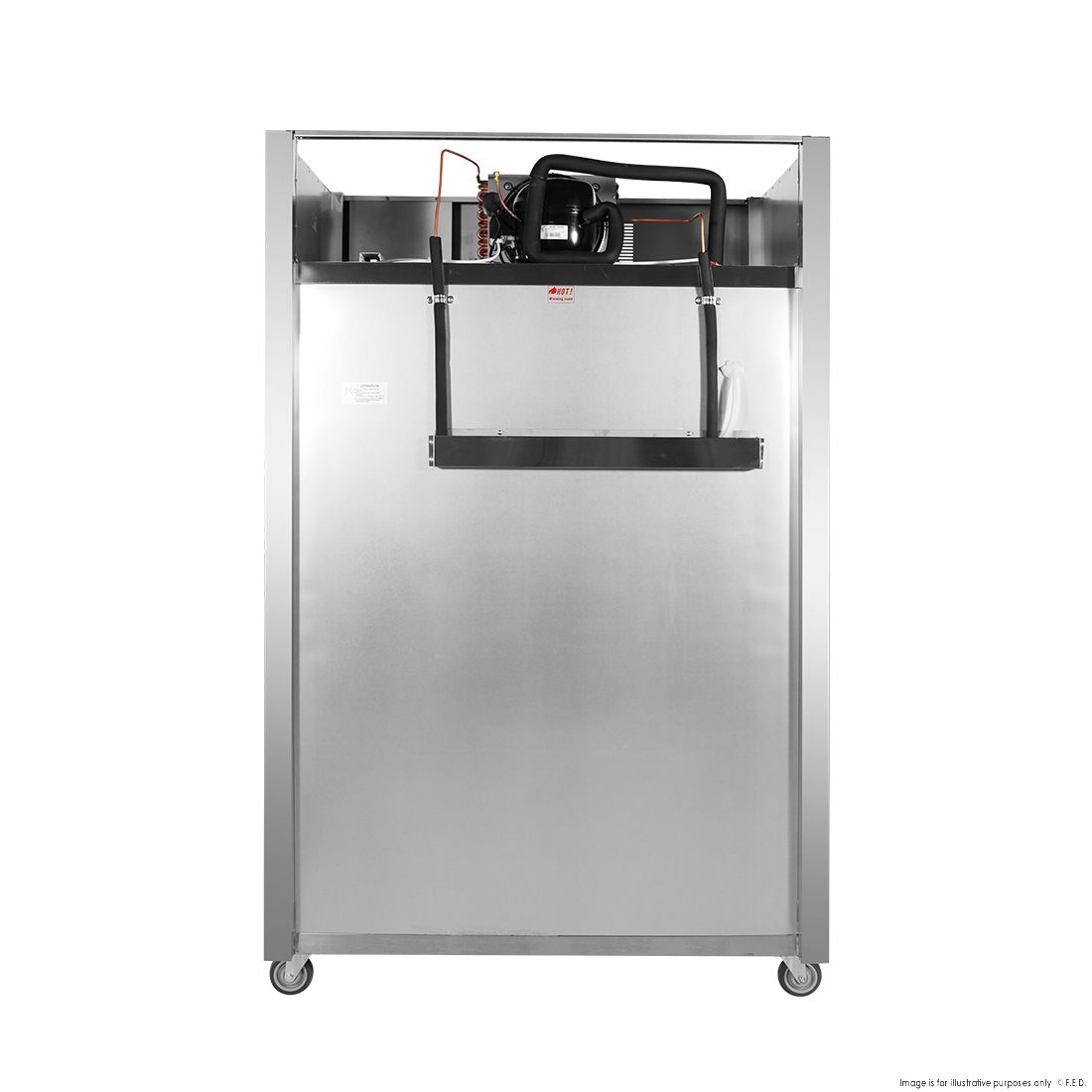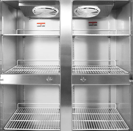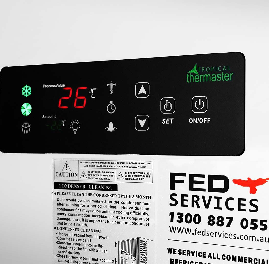 This broad, behemoth of a fridge comes packed with energy-efficient compressors for function, a Dixell digital temp controller, four levels of shelving, fan-forced cooling, castors, and self-drainage.